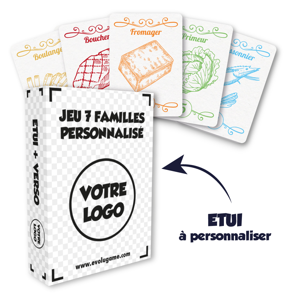 Vous êtes commerçants et vous recherchez une nouvelle idée pour communiquer efficacement auprès de vos clients ? Le jeu de 7 familles personnalisé est idéal pour marquer les esprits et véhiculer un message positif à vos clients ! De plus le jeu de carte personnalisé à votre entreprise vous apportera une grande visibilité lors de toutes les parties de jeu !